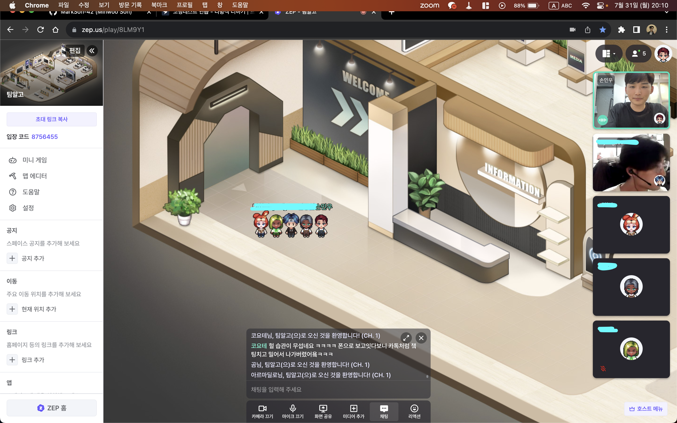 이렇게 zep플랫폼에 모여서 거의 매일 문제를 1~2문제 정도 풀고 해설하는 시간을 가졌다. ㅎㅎ