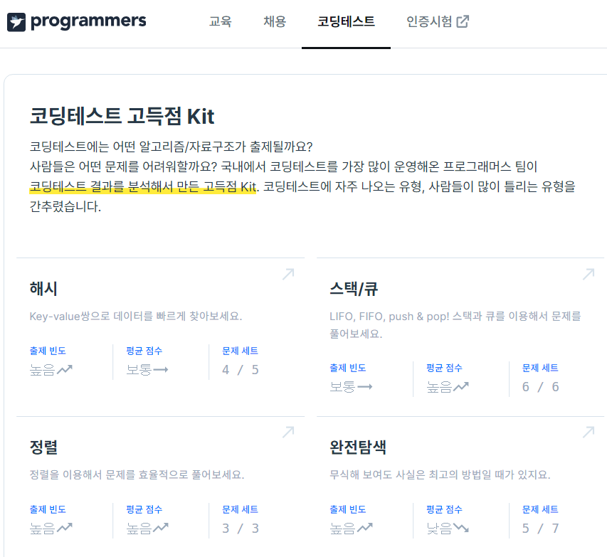 lv1부터 제출수는 많은데, 정답률은 낮은 문제들을 집중적으로 골라풀어보는 식으로 테스트 전까지 40문제정도만 풀고 시험에 임할 생각이다.. 그 중 몇 문제들을 풀어본 뒤, 풀이 최적화 과정을 포스팅하고자 한다.