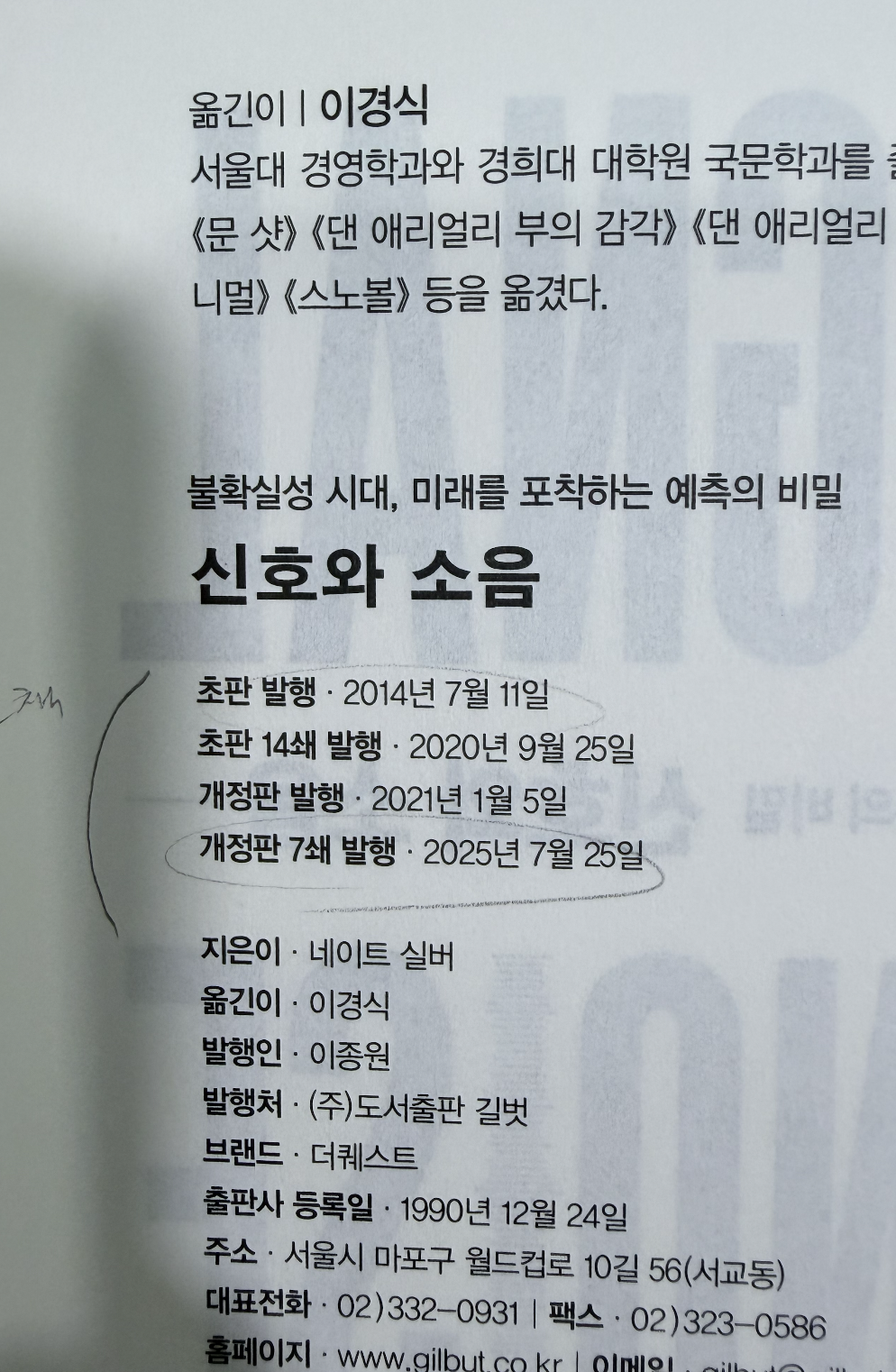 - 부가적으로 책이 얼마나 자주 인쇄되었는지를 본다. 예를들어 아래 「신호와 소음」 의 경우 국내에 초판이 2014년에 나왔는데, 초판 14쇄가 2020년, 개정판이 2021년, 개정판 7쇄가 2025년이다.